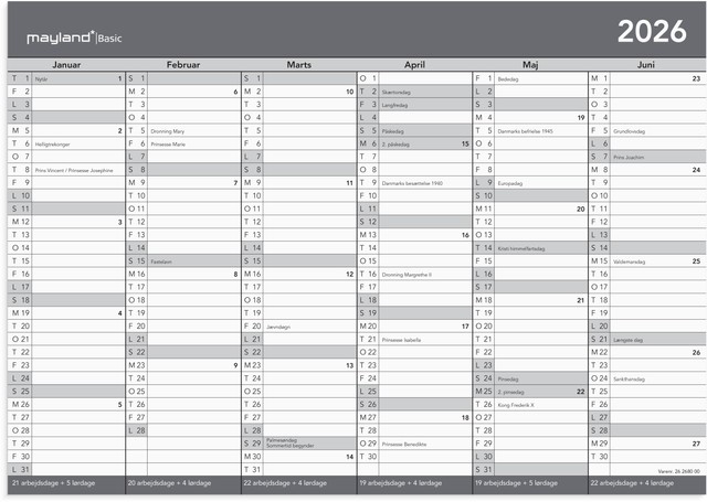 Format: A4. Mål: 1 x 292 x 210 mm. Layout: Halvår/side. Tværformat. Kalendarium: 1.1.2026 – 31.12.2026. Sideantal: 1. Miljøoplysninger: FSC®. Varemærke: Mayland.