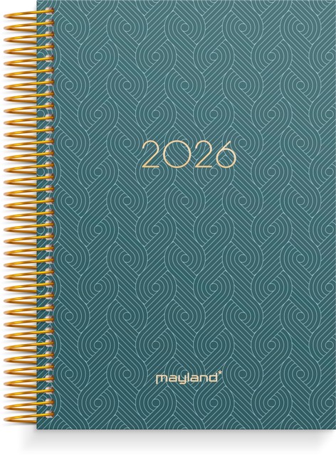Mål: 179 x 24 x 137 mm. Layout: Dag/side. Højformat. Timeinddeling 8-20. Kalendarium: 1.1.2026 – 31.12.2026. Omslag: Karton med blød overflade. Spiralbundet. Detaljer: Plastlomme. Indhold: Månedsregister. Sideantal: 404 + 12 pl. Miljøoplysninger: FSC®. Varemærke: Mayland.