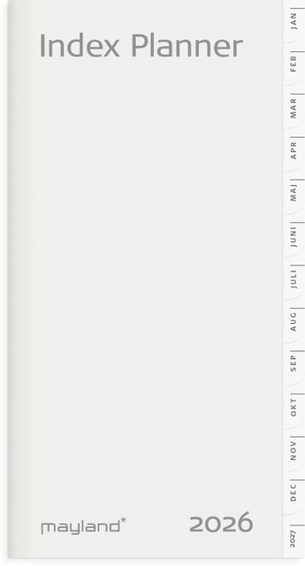 Mål: 168 x 88 x 3 mm. Layout: Måned/opslag. Tværformat. Timeinddeling 8-18. Kalendarium: 1.1.2026 – 31.12.2026. Omslag: Karton. Hæftet. Indhold: Årsoversigter. Sideantal: 36. Miljøoplysninger: FSC®. Varemærke: Mayland.