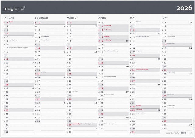 Mål: 72 x 740 x 72 mm. Layout: Halvår/side. Tværformat. Kalendarium: 1.1.2026 – 31.12.2026. Sideantal: 2. Miljøoplysninger: FSC®. Ecolabel. Varemærke: Mayland.