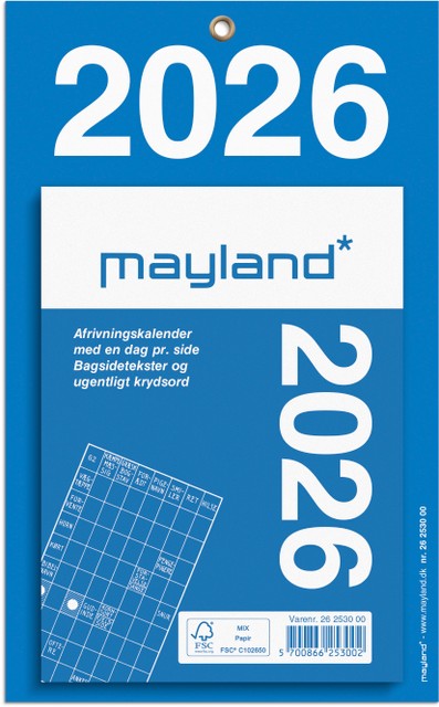 Mål: 30 x 137 x 233 mm. Layout: Dag/side. Højformat. Kalendarium: 1.1.2026 – 31.12.2026. Limet. Indhold: Bagsidetekst. Sideantal: 734. Miljøoplysninger: FSC®. Varemærke: Mayland.