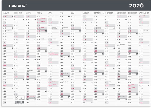 Format: A3. Mål: 419 x 1 x 297 mm. Layout: År/blad. Tværformat. Kalendarium: 1.1.2026 – 31.1.2027. Sideantal: 2. Miljøoplysninger: FSC®. Varemærke: Mayland.