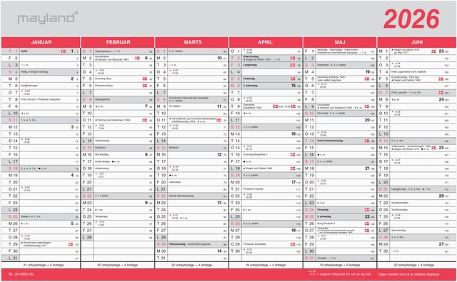 Mål: 388 x 1 x 239 mm. Layout: Halvår/side. Tværformat. Kalendarium: 1.1.2026 – 31.12.2026. Sideantal: 2. Miljøoplysninger: FSC®. Varemærke: Mayland.