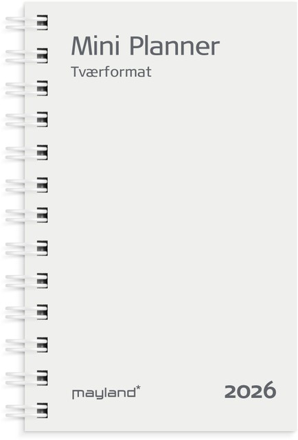 Mål: 85 x 127 x 14 mm. Layout: Uge/opslag. Tværformat. Kalendarium: 1.1.2026 – 31.12.2026. Omslag: Karton. Spiralbundet. Indhold: Månedsoversigter. Sideantal: 144 + 12-pl. Miljøoplysninger: FSC®. Varemærke: Mayland.