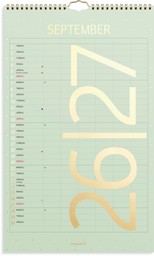 Familiekalender i et simpelt design, som følger skoleåret. Kalenderen er inddelt med en måned pr. side. Hver måned er opdelt i 6 kolonner, så hvert familiemedlem har sin egen kolonne hver dag. På den måde kan du hurtigt og nemt skabe et overskueligt overblik over hele familiens aktiviteter og aftaler. Dertil har hvert kvartal sin egen, flotte farve.