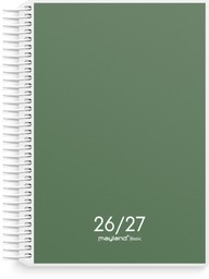 Format: A5. Mål: 213 x 171 x 23 mm. Layout: Uge/opslag. Tværformat. Kalendarium: 1.7.2026 – 30.6.2027. Omslag: Karton med struktur. Spiralbundet. Detaljer: Elastik. Flytbare plastfaner. Papirlomme. Sideantal: 256. Miljøoplysninger: FSC®. Varemærke: Mayland.