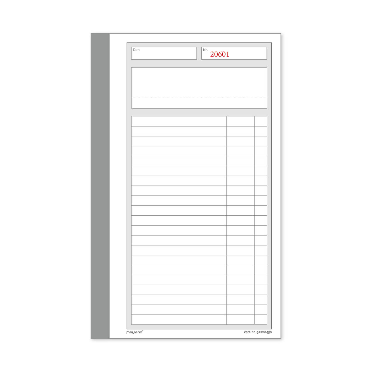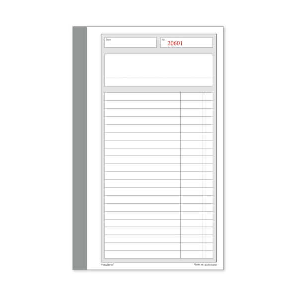 Mayland. Triplikatbog m. talkolonne. 3 x 50 sider m. kopi, 108 x 200 mm. FSC®. Klassisk triplikatbog, der kan bruges til mange forskellige formål i virksomheden, fx følgesedler, regninger, rekvisitioner, timesedler og meget mere. Bogen indeholder 3×50 sider og indlagt karbonpapir. Siderne er nummererede og har felter til dato, firmastempel eller modtager og 21 linjer med talkolonne.