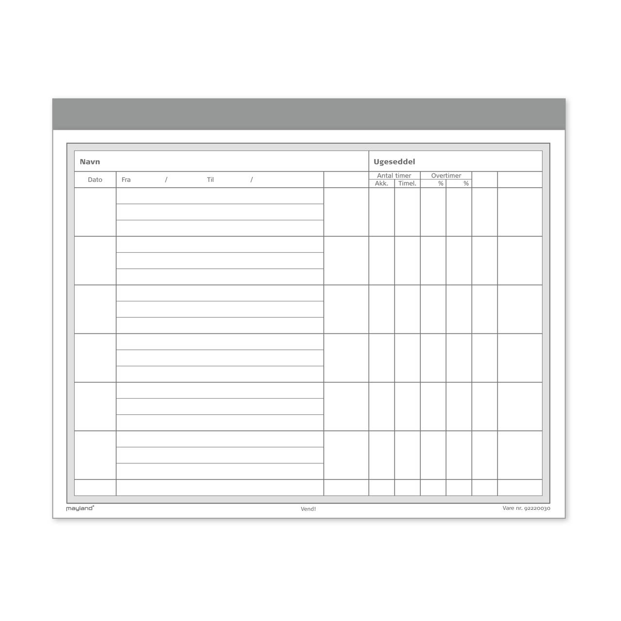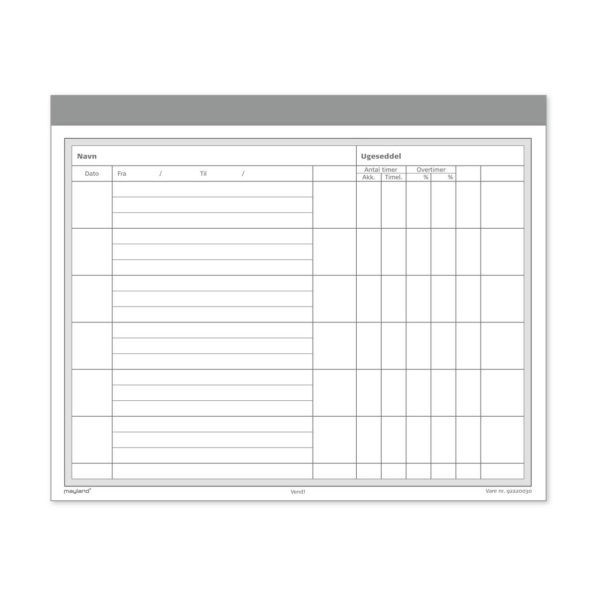Mayland. Ugesedler 2 x 50 sider m. kopi, 200×148 mm. FSC® Blok med arbejdsordre og lønseddel på en side og indlagt karbonpapir. Hver seddel har 6 felter til opgaver med tilhørende dato, timer og overtimer.